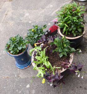 Voor iedereen die komt heeft Ria een klein plantje. Ook heeft ze diverse andere planten te verniksen.